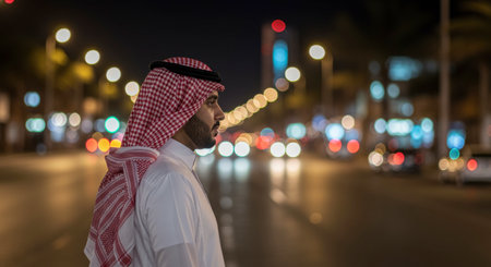 Side view of a Saudi male wearing traditional thobe and ghutra at night on a city street with bokeh lights.