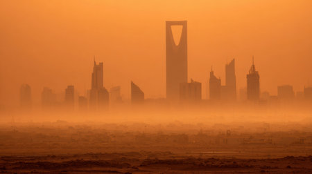 View the Riyadh skyline with buildings outlined in soft shapes against a warm desert haze at sunset.