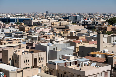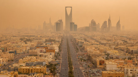 Panoramic view of Riyadh, Saudi Arabia, showcasing the vast urban sprawl, bustling streets, and modern architecture under a bright, sunny sky