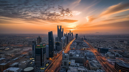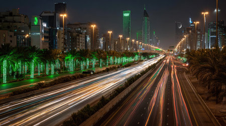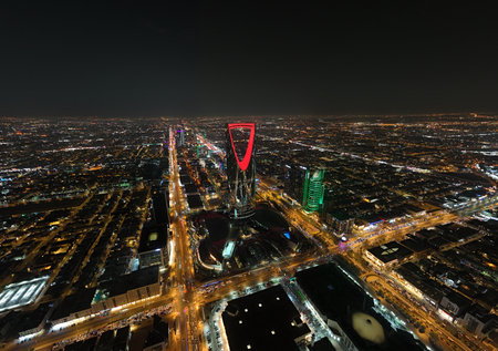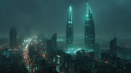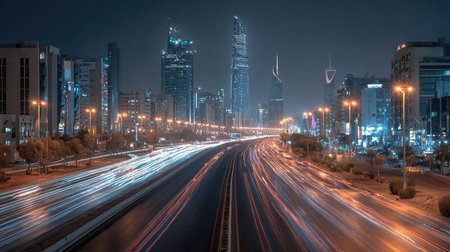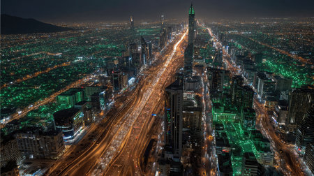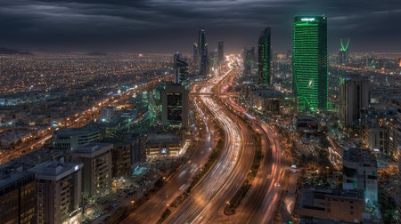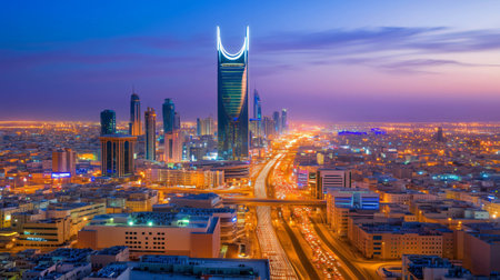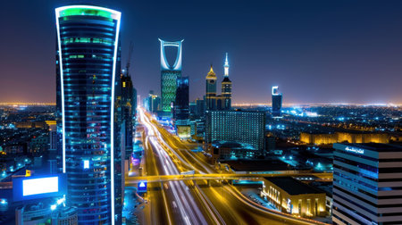 Stunning night view of Riyadh, highlighting impressive skyscrapers and vibrant city lights. This atmospheric cityscape captures urban life and energy.