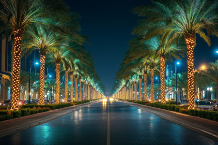 Nighttime cityscape featuring a luminous boulevard adorned with elegant palm trees
