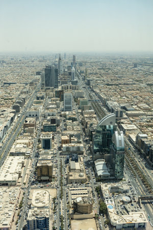 Riyadh, Saudi Arabia, February 14 2020: Aerial view of Riyadh downtown in Saudi Arabia. Photos were taken from the Skybridge in the Kingdom Tower