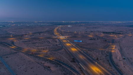 Highway roads in desert with traffic night to day timelapse in a big city from Ajman to Dubai before sunrise. Transportation concept. View from top 4K