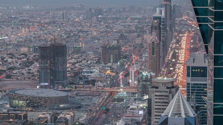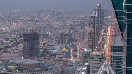 Skyscrapers on Sheikh Zayed Road and DIFC aerial day to night transition timelapse in Dubai, UAE. Traffic on a highway near Financial Centre at evening after sunset from business bay rooftop