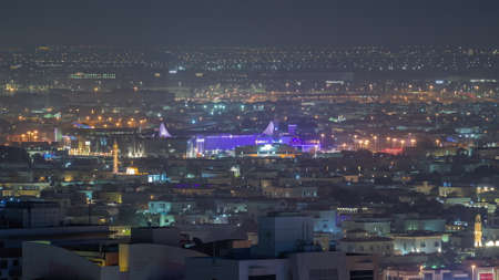Aerial view of neighbourhood Deira and Dubai creek with typical old and modern buildings night timelapse. Stadium and towers. View from skyscraper rooftop. Dubai, United Arab Emirates