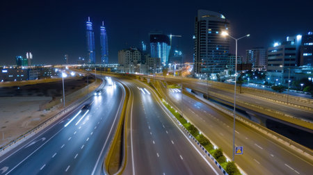 A captivating nighttime view of a vibrant city skyline, highlighting illuminated highways that weave through modern architecture, showcasing urban life.