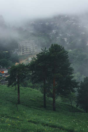 High mountain with green slopes hidden in thick clouds and fog. Heavy fog in the mountains on a cloudy day. Green mountain slope with cable cars and ski runs at overcast summer day.