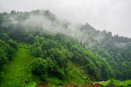A nature house in the fog. The image was taken in the Rize region of the Black Sea region of northeastern Turkey.