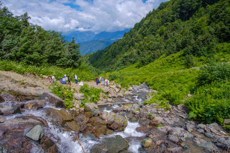Rosa Khutor. Russia. July 28, 2019. People visit waterfalls in the Caucasian mountains. Climbing uphill along the mountain river. Outdoor activities. Summer sunny day.
