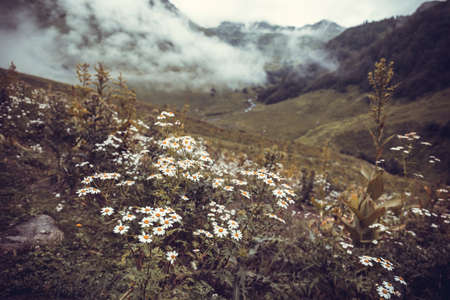 Mountain landscape with fog in the morning. Caucasus Mountains, Georgia.
