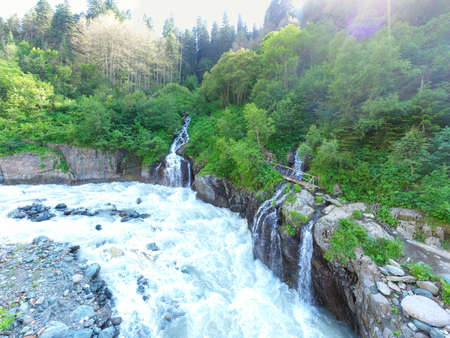 Spring streams of water and waterfalls on mountain streams in Dombay, mountainous territory, ski resort and nature reserve of the North Caucasus