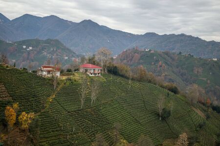 Amazing view at Tea Plantation Landscape Garden Rize Turkey House Green. Drone view
