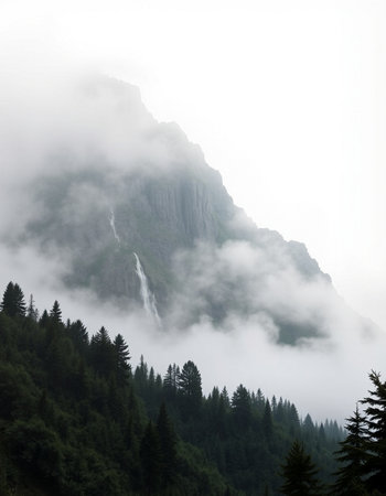 A moody landscape of a mountain range covered in thick fog and mist. Dark evergreen trees frame the view, creating a mysterious and atmospheric scene.