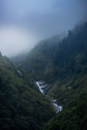 Moody and spooky cinematic forest in mountain during rain. Clouds and fog on mountain cover forest valley