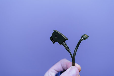 Male fingers hold a German telephone cable against a violet background, highlighting the small details of the cable and contrasting with the vibrant backdrop