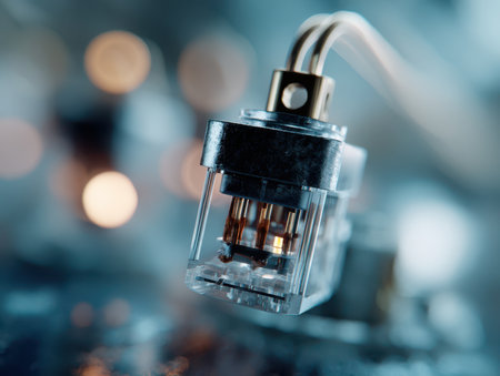 Clear close-up of a connector with metal pins inside a transparent casing, wires attached. Background features blurred circles of warm light, creating a bokeh effect