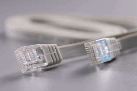 White internet connectors placed on grey surface, cable with plastic clip at tip