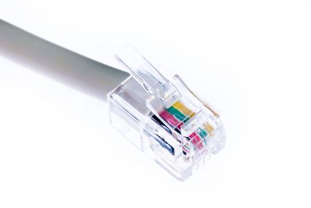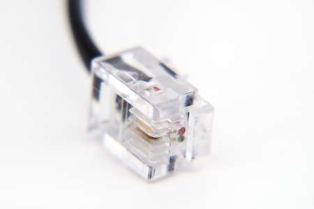Transparent telephone plug on a cable showing the colored wires over white in a telecommunications concept