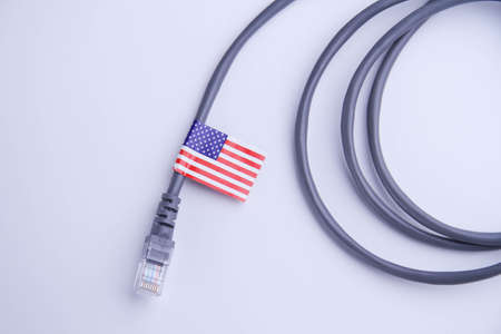 Internet cable with America flag. Internet cable with USA flag. Connecting a PC to the Internet in the USA. Multicore cable close-up on a white background.