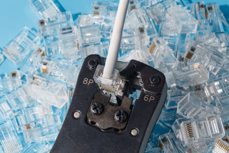 Several network Internet connectors on a black background shot in macro mode. Visible metal connectors of connectors.