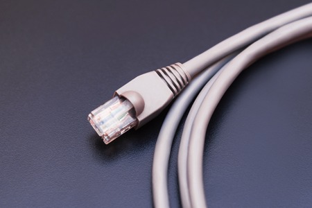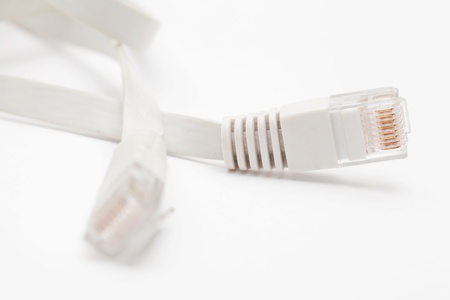 White internet connectors placed on grey surface, cable with plastic clip at tip