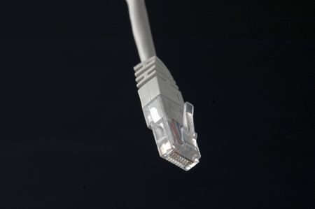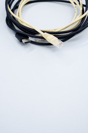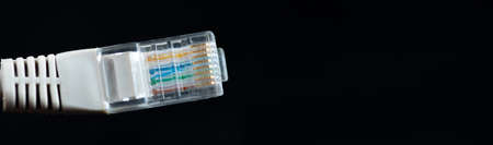 Rj45 cords on the stage. Computer accessories used in network connections. Black background.