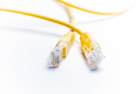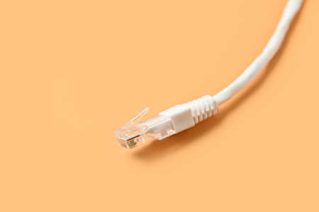 cables with RJ45 plug on yellow background. Close-up, selective focus