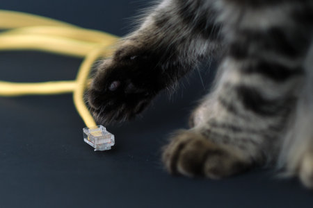 cat sits next to the cable from the Internet and touches the cable with its paw. curious cat plays with a wire from the internet.