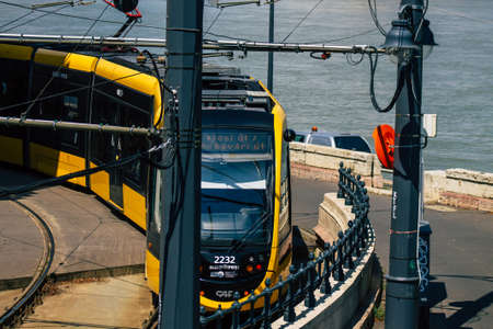 Budapest Hungary july 20, 2020 View of a new Hungarian electric tram for passengers driving through the streets and part of the public transport system of Budapest, the capital of Hungary