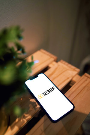 October 3, 2022: 123RF logo on smartphone screen. Smartphone on wooden table with plant.