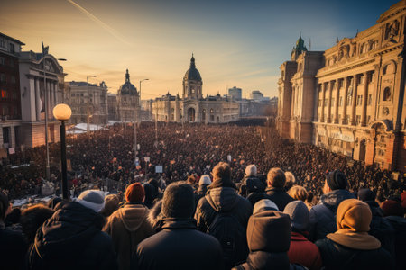 A large rally with people who are aggressively and confidently moving towards the realization of their just plans, a rally in the center of a large city.