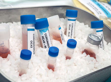Vials with samples of SARS-COV-1 prepared cold in a laboratory, epiedomological study on Sars-CoV-2 Covid-19, conceptual image