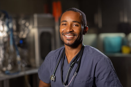 Smiling man in medical scrubs with stethoscope around neck, standing indoors with blurred metallic and colorful objects in the background, emitting a warm and professional demeanor