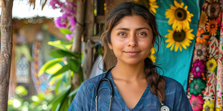 portrait of Hispanic female nurse wearing scrubs and stethoscope.