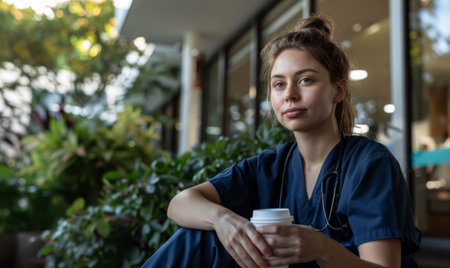 A young nurse in scrubs sitting outside a hospital, holding a coffee cup. soft focus edges, subtle grain, horizontal photo