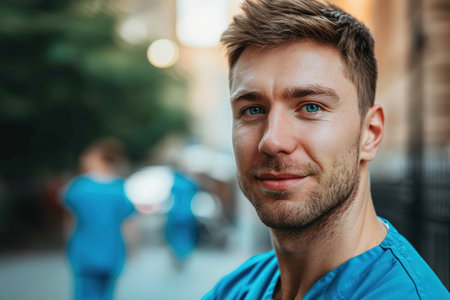 European Caucasian male nurse with blue scrubs standing outdoors with a blurred background