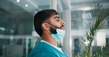Closeup portrait of very tired exhausted UK NHS ICU doctor in front of hospital,Coronavirus COVID-19 pandemic outbreak crisis,sleep deprived EMS medical staff working long shifts,ER patient treatment