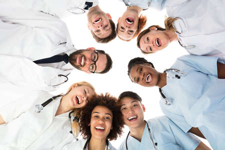 Low Angle View Of Smiling Medical Team Standing Against White Background