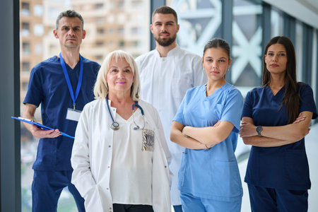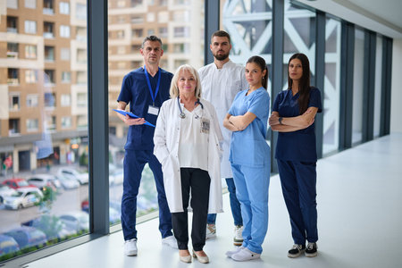Healthcare professionals standing confidently in a modern medical facility during the daytime