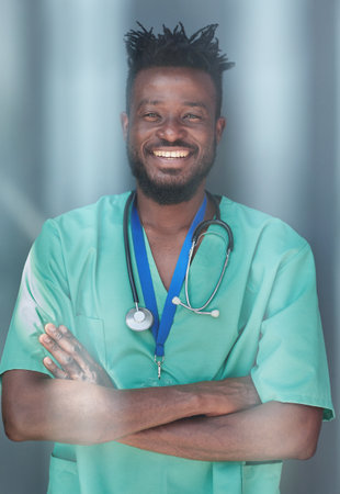 Portrait of smilin young and motivated doctor with stethoscope over neck