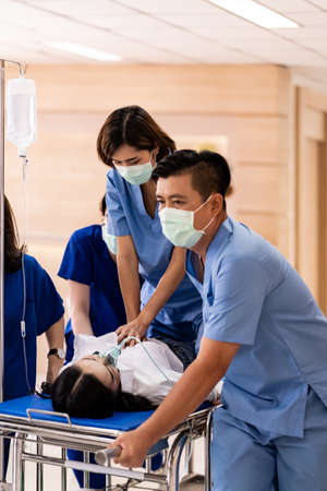 Close up Medical team do CPR to seriously injured patient with oxygen mask while push gurney stretcher bed to Operating Room. Emergency health care and medical hospital concept.