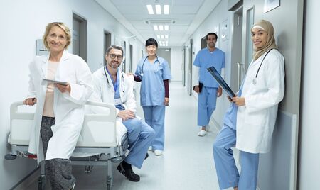 Front view of happy diverse doctors and surgeons looking at camera in the corridor at hospital