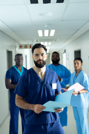 Vertical portrait of caucasian male healthcare worker in hospital corridor, with diverse colleagues. Hospital, medical and healthcare services, copy space.