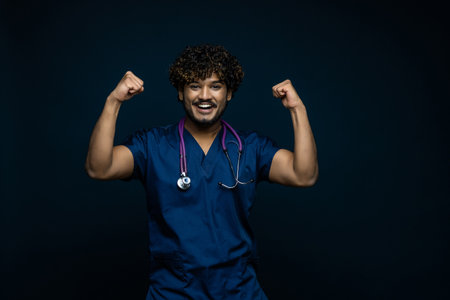 Winning success nurse working overtime on night celebrating being a winner in hospital office. Victory, delight concept. Health care and medicine service