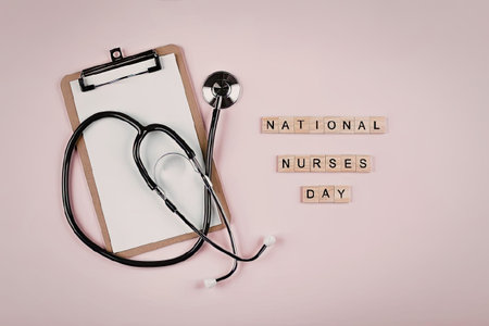 A stethoscope and clipboard on a pink background with National Nurses Day text