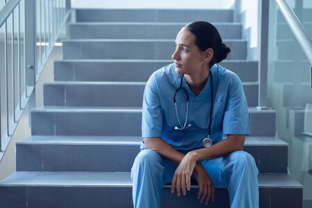Front view of thoughtful mixed race female doctor sitting on staircase in the hospital