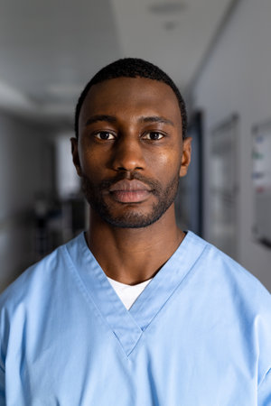 Portrait of african american male healthcare worker in hospital corridor, copy space. Hospital, medical and healthcare services.