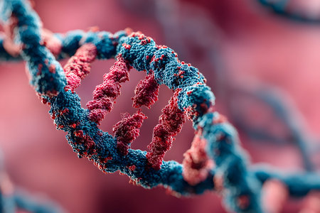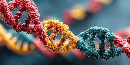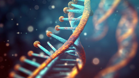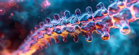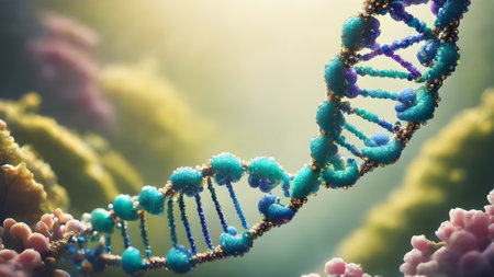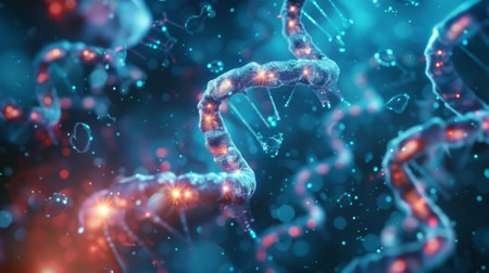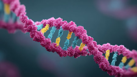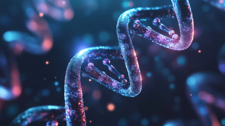 Close up view of DNA double helix structure, showcasing intricate details and vibrant colors. image captures beauty of molecular biology, highlighting complexity of genetic material