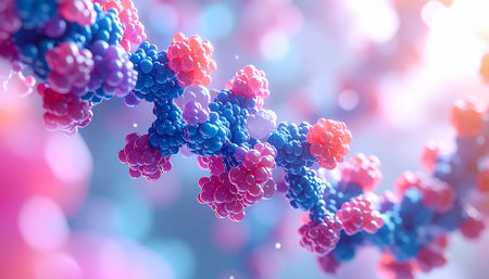 Colorful molecular structure representing DNA strands illuminated in vibrant colors against a blurred background