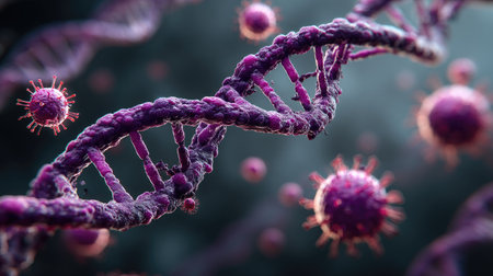 Close up view of a molecular RNA chain surrounded by various viruses, showing complex biological interactions at the microscopic level.